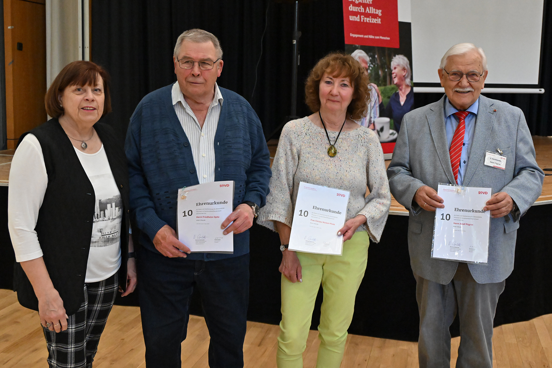 Monika Hoffmeister vom Kreisverband übernahm die Ehrung für zehn Jahre Funktionstätigkeit: Ausgezeichnet wurden Friedhelm Opitz, Christa Weilert-Penk und Adolf W. Pilgrim.