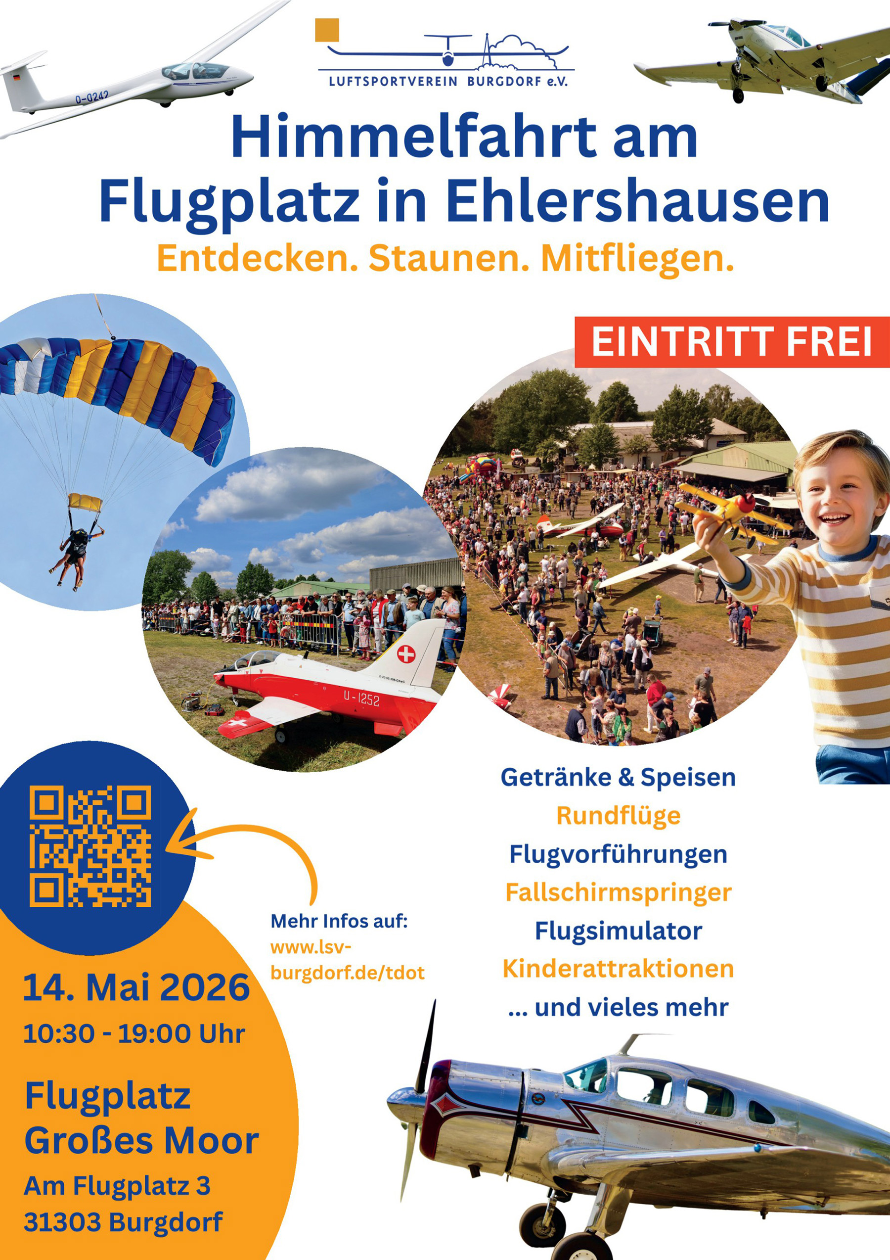 Der Luftsportverein Burgdorf lädt am Donnerstag, 14. Mai 2026, zu Christi Himmelfahrt, ab 10:30 Uhr zum Tag der offenen Tür auf den Flugplatz Ehlershausen ein. Besucher erwartet ein abwechslungsreiches Programm für die ganze Familie rund um Segelflug, Motorflug und Fallschirmsport.